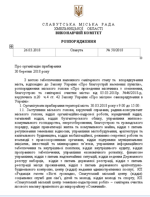 ПРО ОРГАНІЗАЦІЮ ПРИБИРАННЯ 30 БЕРЕЗНЯ 2018 РОКУ Дата 28.03.2018 Створив info-mvk Прес-служба Славутського МВК