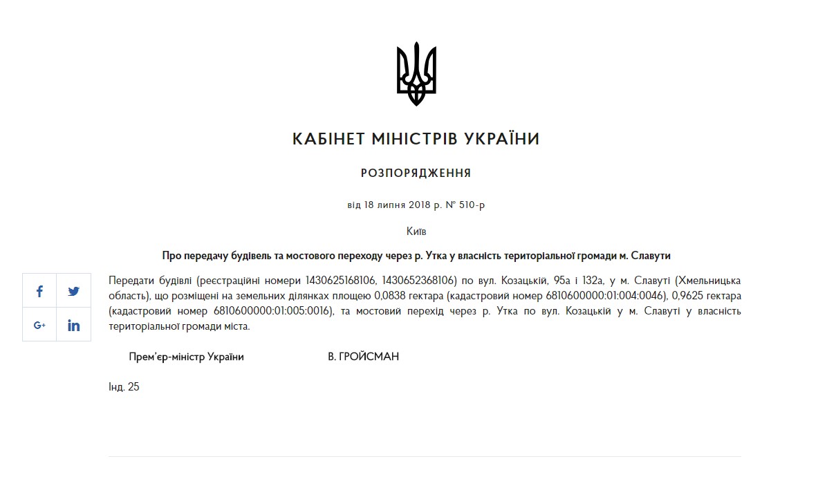 На неодноразові звернення виконавчого комітету Славутської міської ради до вищих органів влади та судові процеси щодо передачі з державної в комунальну власність територіальної громади міста Славути обʼєктів соціальної інфраструктури: Будинку культури по вул. Козацька, 132 «А», будівлі колишньої поліклініки по вул. Козацька, 95 «А», мостового переходу через річку Утка Кабінетом міністрів України було прийнято розпорядження, що подано нижче.
