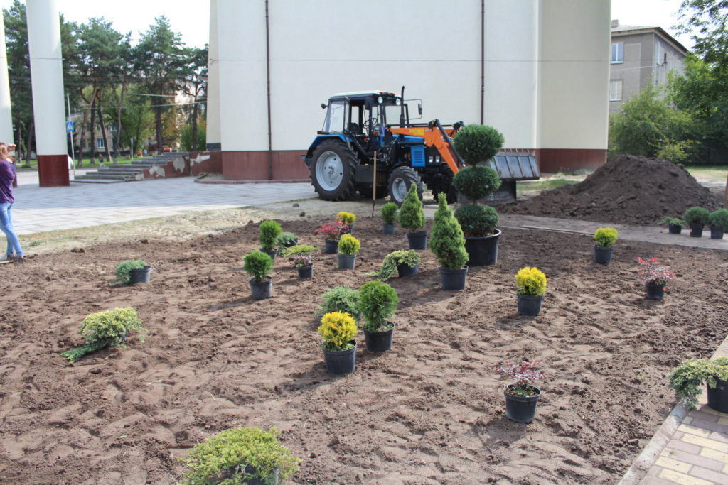 - Виконуються роботи із благоустрою площі біля Славутського історичного музею: завезено грунт та висаджено саджанці декоративних кущів.