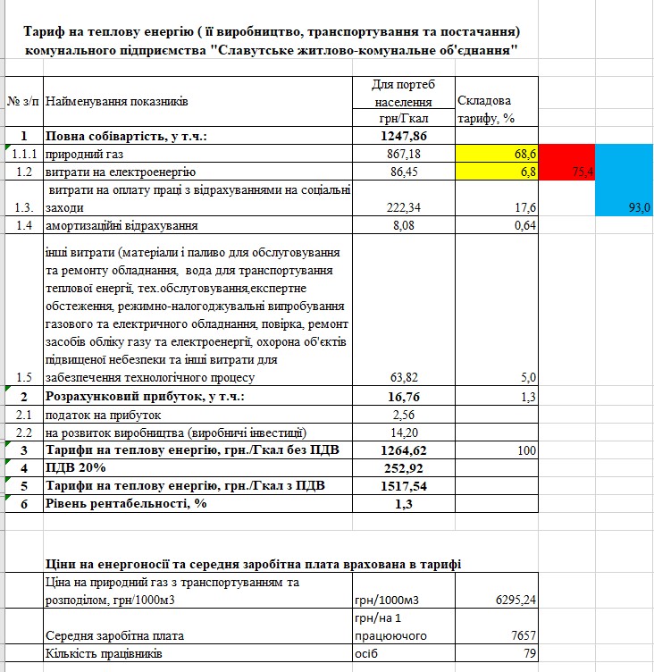 93% тарифу залежить від показників, на які ні комунальне підприємство, ні орган місцевого самоврядування вплинути не можуть, оскільки їх рівень залежить виключно від рішення державних органів влади (Верховної Ради України, Кабінету Міністрів та підконтрольних їм структур) – це ціна на природний газ, електроенергію та мінімальна заробітна плата.