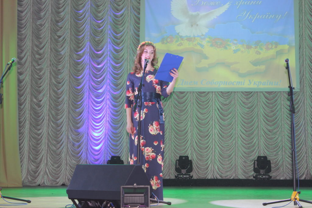 Ведуча заходу Ірина Марчук, розпочинаючи урочистий концерт, наголосила, що День Соборності України – це не просто свято рідного краю, це свято нашої держави, адже соборність – це символ: символ боротьби за волю, за порозуміння між людьми, це надія і віра у квітуче майбутнє.