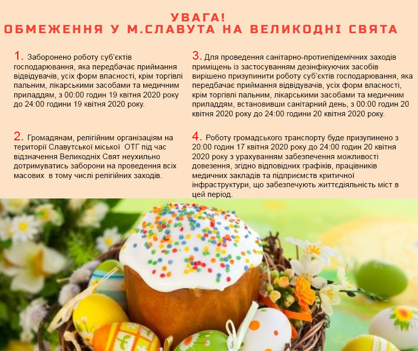 ▶️ 2. Громадянам, релігійним організаціям на території Славутської міської ОТГ під час відзначення Великодніх Свят неухильно дотримуватись заборони на проведення всіх масових в тому числі релігійних заходів, закріплених в постанові Кабінету Міністрів України №211 від 11 березня 2020 р. (зі змінами).