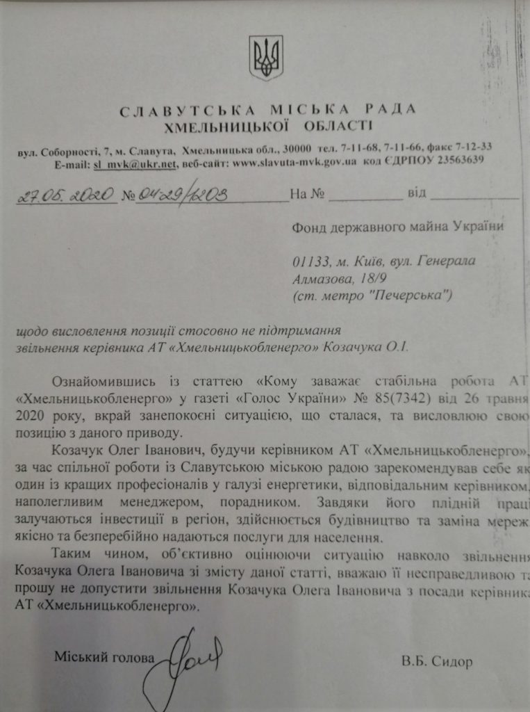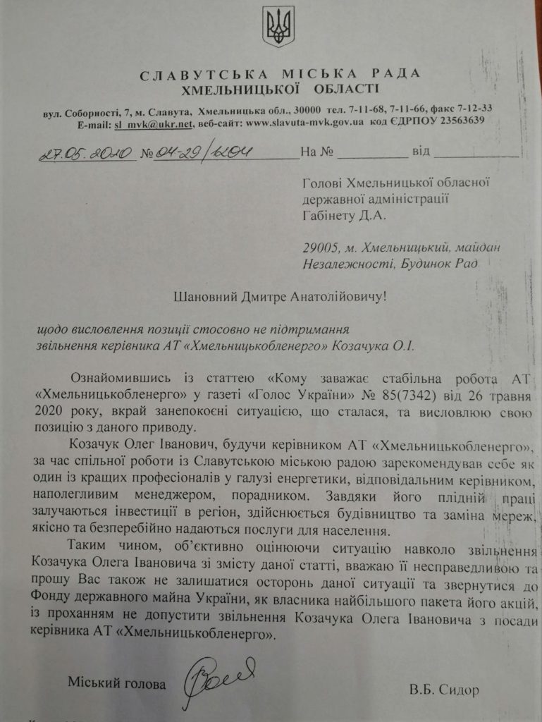 Міський голова Василь Сидор, будучи вкрай занепокоєним ситуацією з приводу звільнення керівника АТ «Хмельницькобленерго» Олега Козачука та змісту статті «Кому заважає стабільна робота АТ «Хмельницькобленерго» у газеті «Голос України» № 85 (7342) від 26 травня 2020 року (http://www.golos.com.ua/article/331159), звернувся з відповідними листами до голови Хмельницької ОДА Д. Габінета та Фонду державного майна України, де висловив свою позицію з даного приводу.