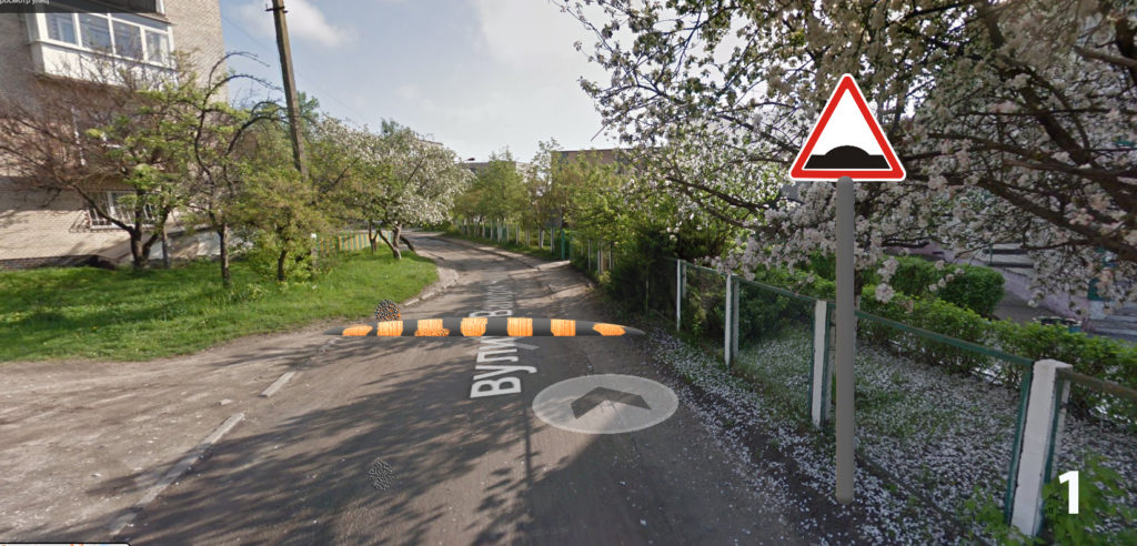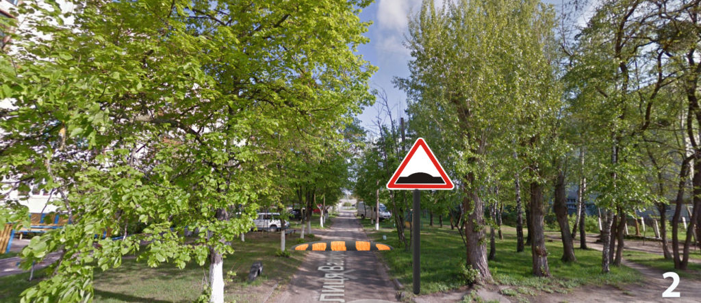 - двох пристроїв примусового зниження швидкості в комплексі з чотирма попереджувальними дорожніми знаками 1.11 «Пагорб» на вул. Чкалова (див. фото 1 та 2);