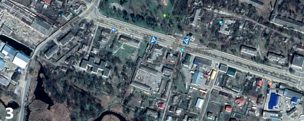 - горизонтальної дорожньої розмітки 1.14.1 «зебра», в комплексі з двома інформаційно-вказівними дорожніми знаками 5.35.1 «Пішохідний перехід» на вул. Миру (див. фото 3);