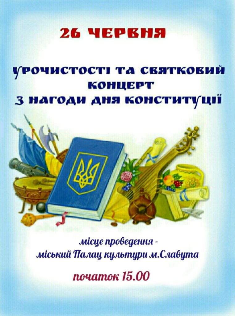 26 червня о 15.00 у міському Палаці культури відбудуться урочистості та святковий концерт з нагоди Дня Конституції України.