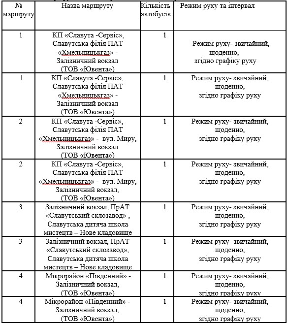 Маршрут  №1 – «КП «Славута -Сервіс», Славутська філія ПАТ «Хмельницькгаз», Залізничний вокзал,  (ТОВ «Ювента»)» – продовжено рух автобусів до КП «Славута -Сервіс»,  автобуси будуть рухатися по вул. Лісній, Ринок, військове містечко, Епіцентр – розворот, вул. Соборності, Козацька, Залізничний  вокзал, ТОВ «Ювента»; за окремим розкладом буде рухатися до ТОВ «Аква-Родос», Професійний ліцей; на даному маршруті задіяно 2 автобуси.