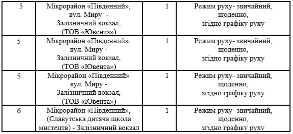 Маршрут  №5«Мікрорайон «Південний», вул. Миру – Залізничний вокзал, (ТОВ «Ювента»)» автобуси будуть рухатися: Мікрорайон «Південний», вулиці – Зарічна, Плотиче, Монастирська, Б. Хмельницького, ринок, військове містечко, Епіцентр – розворот, вул. Соборності,  Миру,  залізничний  вокзал, ТОВ «Ювента»; за окремим розкладом буде рухатися до ТОВ «Аква-Родос», Професійний ліцей; на даному маршруті задіяно 3 автобуси;
