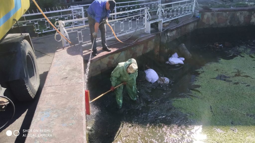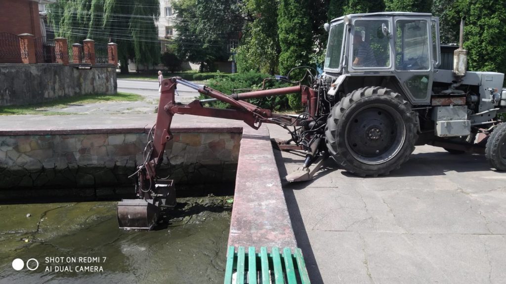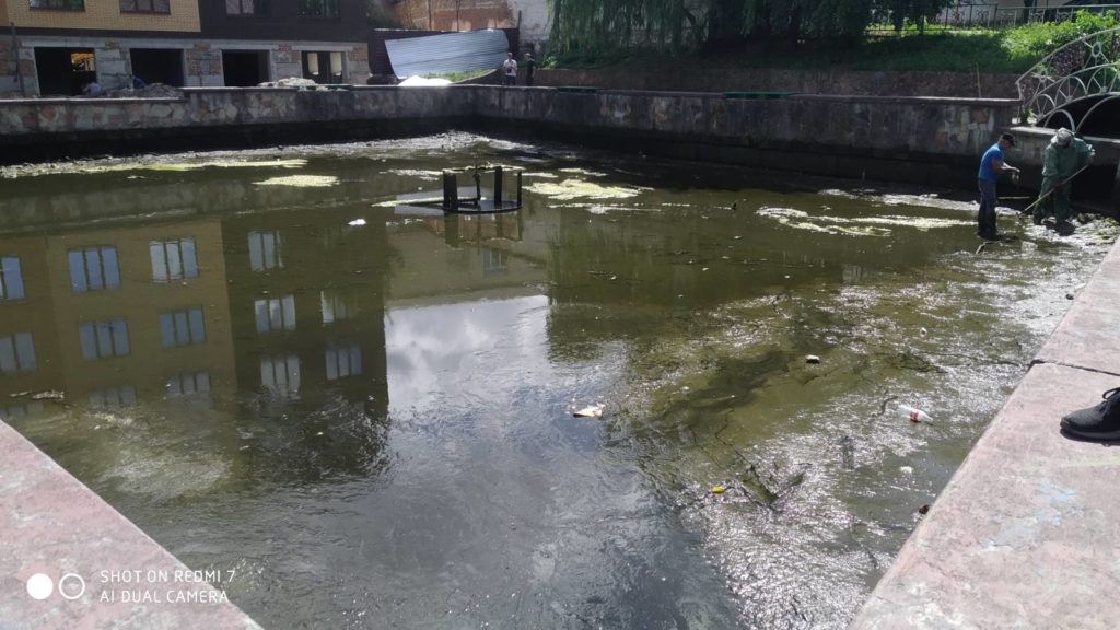 Працівниками КП «Славута-Сервіс» виконуються роботи із очистки фонтану, що у центрі міста, проводиться косіння трави по місту, на території памʼятних місць та скверів.