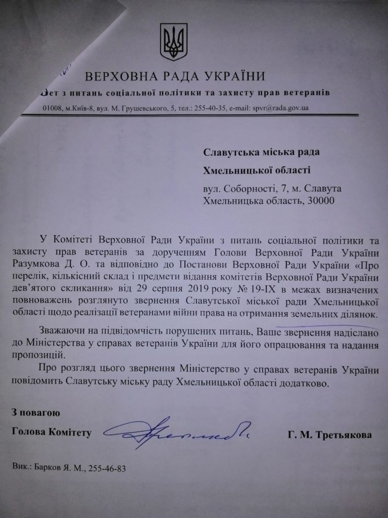 Депутатами Славутської міської ради надіслано звернення (додаток до рішення сесії від 03.07.2020р., № 25-52/2020) до Президента України В. Зеленського, Голови Верховної Ради України Д.Разумкова, народного депутата О.Жмеренецького щодо реалізації ветеранами війни права на отримання земельних ділянок.