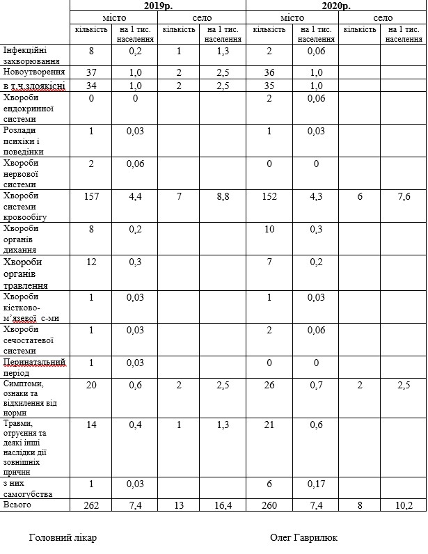 За 8 місяців 2020 року померло 260 жителів міста і 8 по селу, показник смертності 7,45/тис.