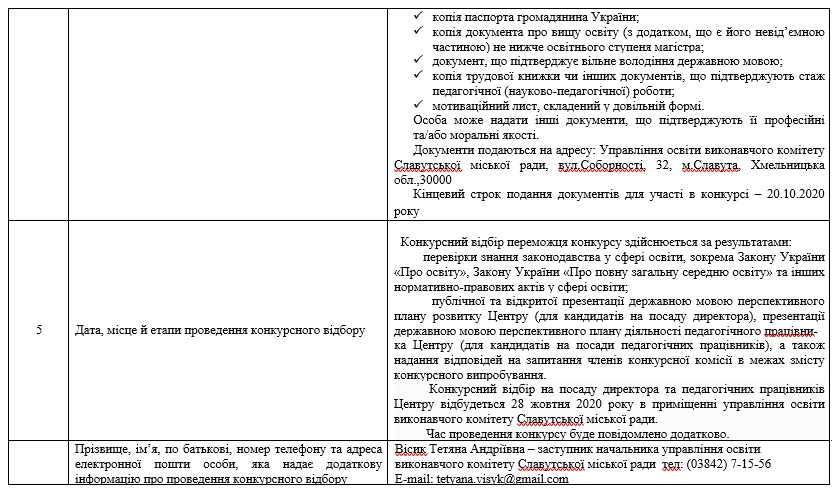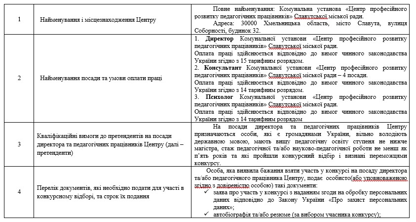 про проведення конкурсного відбору на посади директора та педагогічних працівників (консультантів, психолога) комунальної установи «Центр професійного розвитку педагогічних працівників» Славутської міської ради (далі Центр).