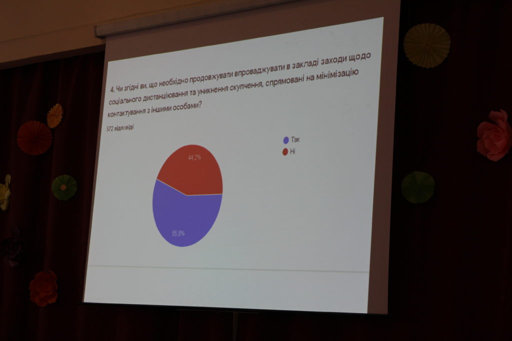 Найбільшу дискусію визвало питання до батьків «Чи згідні Ви, що необхідно продовжувати впроваджувати в закладі заходи щодо соціального дистанціювання, уникнення скупчень, спрямованих на мінімізацію контактування з іншими особами?» – у результаті 44% усіх респондентів, за якими стоять сотні дітей, не розуміють запроваджених у школі протиепідемічних заходів, які діють по всій країні. Їх важко переконати, що безпека учнів – це нагальне завдання педагогічного колективу.