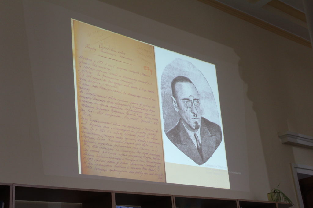 Далі, презентуючи відео-ряд, пан Владислав ознайомив гостей зустрічі із особистостями, які стали засновниками краєзнавчої справи Славутчини, та їх діяльністю. Серед них – Володимир Кочубей, який і став перший директором Шепетівського окружного музею у Славуті.