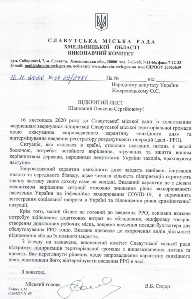 МІСЬКИМ ГОЛОВОЮ ВАСИЛЕМ СИДОРОМ НАПРАВЛЕНО ВІДКРИТІ ЛИСТИ НАРОДНОМУ ДЕПУТАТУ УКРАЇНИ О. ЖМЕРЕНЕЦЬКОМУ ТА ГОЛОВІ ХМЕЛЬНИЦЬКОЇ ОБЛДЕРЖАДМІНІСТРАЦІЇ Д. ГАБІНЕТУ Дата 16.11.202016.11.2020 Створив info-mvk щодо відміни карантину “вихідного дня” та відтермінування реєстратора розрахункових операцій (РРО)