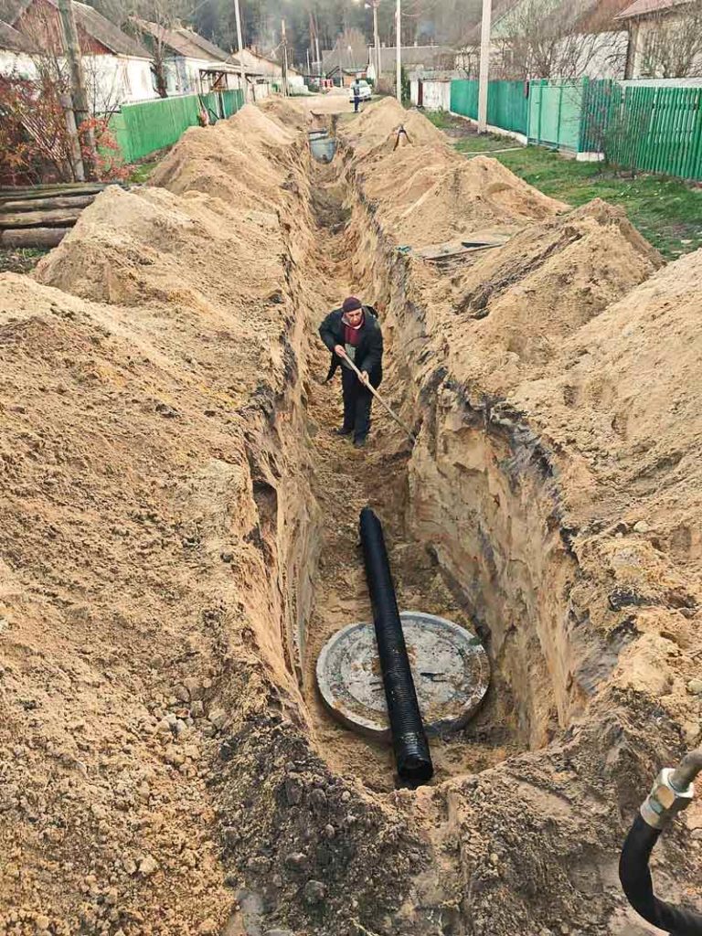 2. У мікрорайоні «Південний» на вул. Довженка продовжуються роботи із будівництва каналізаційних мереж. Зважаючи на існуючи комунікації електричних мереж, газових та водогінних систем постачання, піщаний ґрунт, який постійно осипається з стінок канави, робота із прокладення каналізації є надзвичайно складною. Незважаючи на це, прокладено 95 метрів труби ПВХ (полівінілхлоридної) діаметром 200 мм., яка підключена до центрального коллектору. Змонтовано чотири колодязі інженерних комунікацій.
