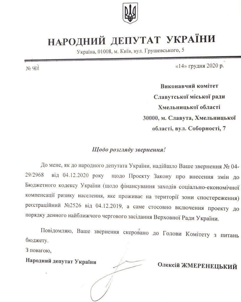 з проханням ініціювати включення до порядку денного найближчого чергового засідання Верховної Ради України та проголосувати за прийняття законопроєкту № 2526 від 04.12.2019 р. «Про внесення змін до Бюджетного кодексу України (щодо фінансування заходів соціально-економічної компенсації ризику населення, яке проживає на території зони спостереження)», відповідно до якого збір на соціально-економічну компенсацію ризиків населення, що проживає в зоні спостереження, запропоновано повернути до спеціального фонду Державного бюджету.