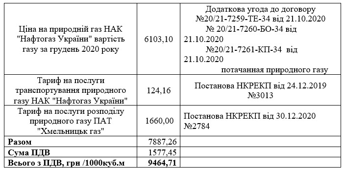 Враховуючи вищевказане, вартість  закупівлі природного газу  з врахуванням ціни самого газу та послуг з транспортування природного газу за грудень 2020 року і послуг з розподілу природного газу за січень 2021 року порівняно із ціною, що врахована у діючому тарифі  на теплову енергію збільшилася  на 10,4% (з 8576,71грн /1000куб.м з ПДВ до 9464,71 грн/1000куб.м з ПДВ).