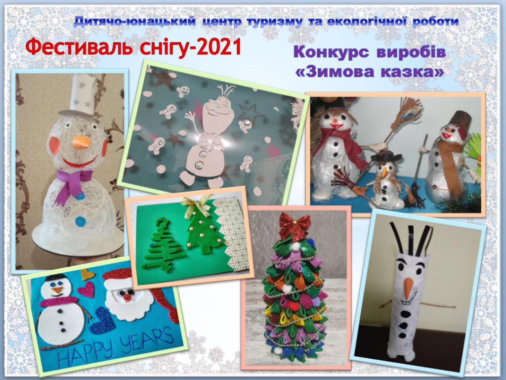 У конкурсі виробів «Зимова казка» вражають роботи наших юних майстрів: Антонюк Ірини та Ящук Анни (гурток «Людина і довкілля»), Баклан Оксани та Петрука Арсена (гурток «Народна творчість»), Нікітчука Дмитра (гурток «Паперопластика»), Лук’янчук Аріни (гурток «Спортивний туризм»).