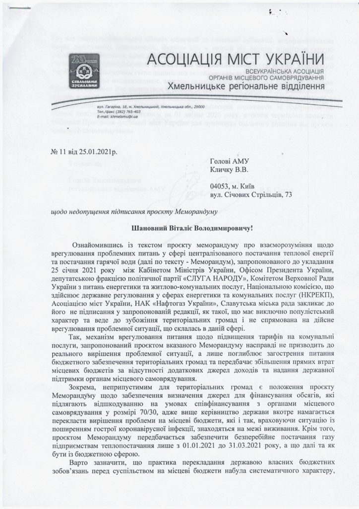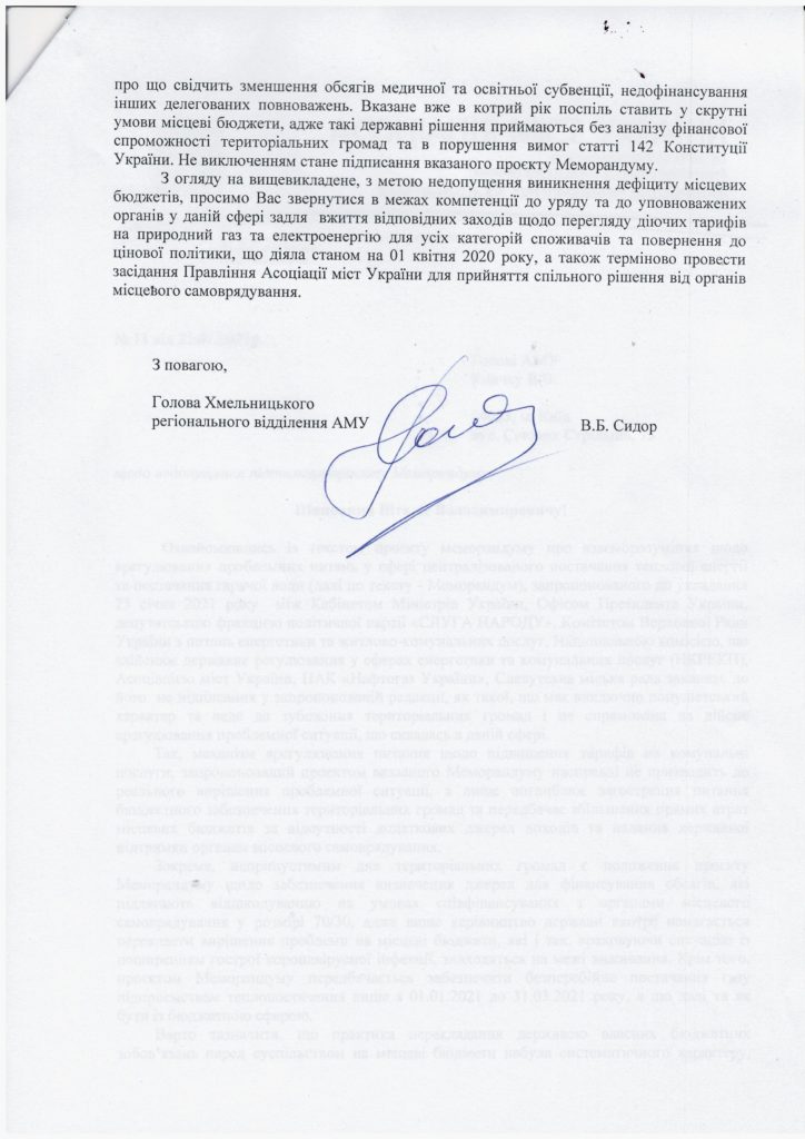 Міський голова м. Славута, голова Хмельницького РВ АМУ Василь Сидор виступає проти підписання проєкту меморандуму про взаєморозуміння щодо врегулювання проблемних питань у сфері централізованого постачання теплової енергії та постачання гарячої води, запропонованого до укладання 25 січня 2021 року між Кабінетом Міністрів України, Офісом Президента України, депутатською фракцією партії «СЛУГА НАРОДУ», Комітетом Верховної Ради України з питань енергетики та житлово-комунальних послуг, НКРЕКП, Асоціацією міст України, НАК «Нафтогаз України».
