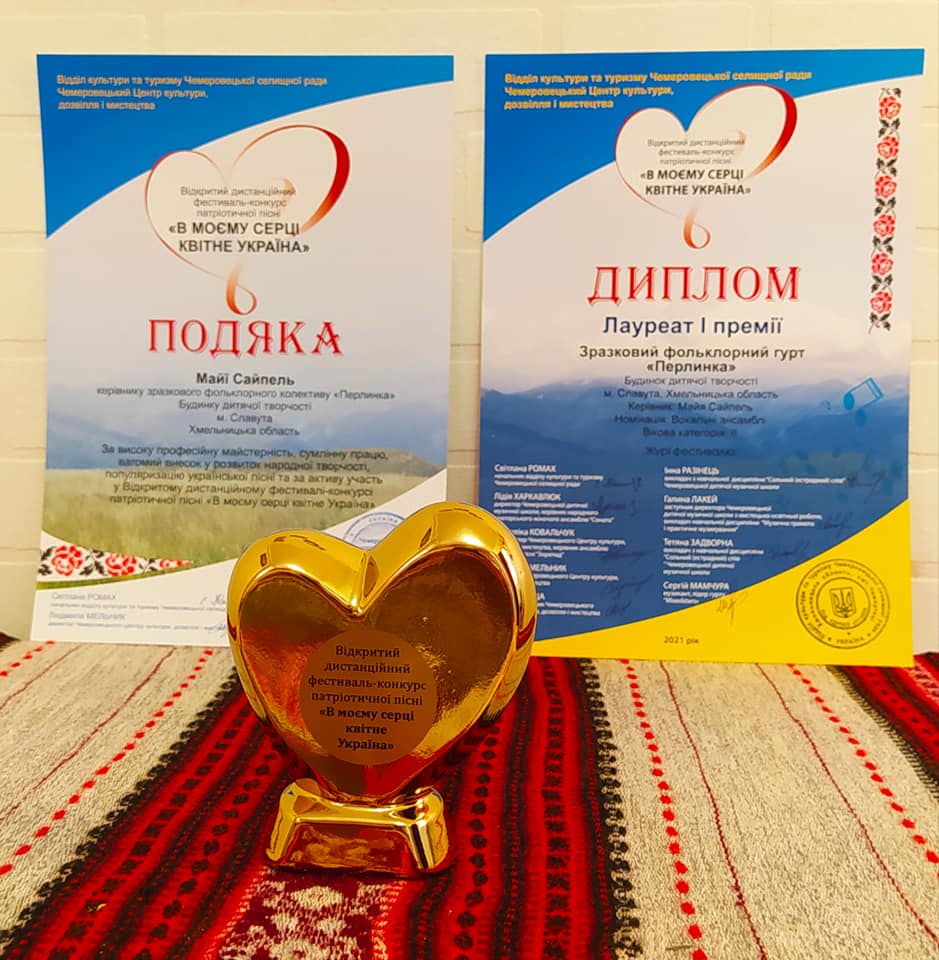 Учасники зразкового фольклорного гурту “Перлинка” (керівник Майя Сайпель) – лауреати I премії Всеукраїнського фестивалю- конкурсу патріотичної пісні ” В моєму серці квітне Україна”!
