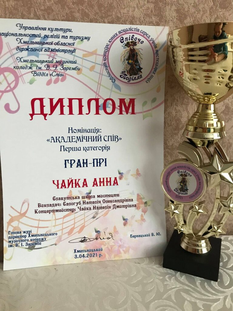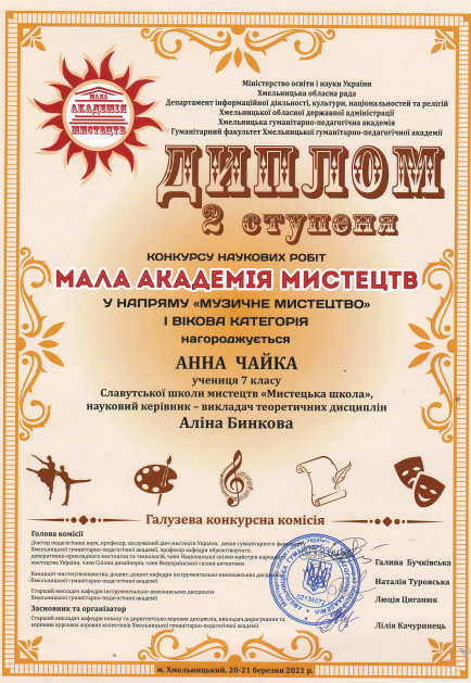 У конкурсі взяла участь учениця Школи мистецтв Анна Чайка і отримала найвищу нагороду – Гран-прі (викладач Наталія Салогуб), але це ще не все. Анна брала участь у мистецькому конкурсі наукових робіт «Мала Академія Мистецтв» у напрямку «Музичне мистецтво» 1 вікова категорія який проводила Хмельницька гуманітарно-педагогічна академія . 20-21 березня відбулась підсумкова практична конференція – Анна отримала диплом 2 ступеня (керівник Аліна Бинкова).