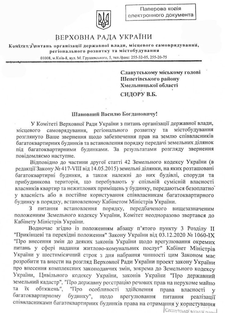 У Комітеті Верховної Ради України з питань огранізації державної влади, місцевого самоврядування, регіонального розвитку та містобудування розглянуто звернення Славутської міської ради щодо забезпечення прав на землю співвласників багатоквартирних будинків та встановлення порядку передачі земельних ділянок під багатоквартирними будинками. За резульатами розгялду звернення повідомлємо наступне.