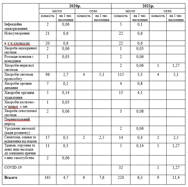 Всього померло в січні-травні 2020 року 165 хворих, показник смертності – 4,6/тис. В аналогічному періоді 2021 року померло 220 хворих, показник смертності – 6,1/тис.