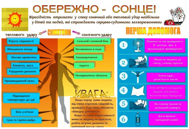 Шановні громадяни, не зловживайте витривалістю свого організму! Небезпека сонячного і теплового удару збільшується при фізичному навантаженні і відсутності води. Організм не встигає охолоджуватися і швидко перегрівається. В усіх випадках перегрівання організму слід терміново викликати лікаря.