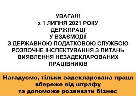 В черговий раз звертаємо увагу роботодавців на недопущення використання незадекларованої праці. Якщо ви вважаєте, що використання незадекларованої праці спрощує ведення бізнесу та зменшує фінансові витрати, ви помиляєтеся. Фінансові ризики і наслідки використання незадекларованої праці значно перевищують витрати, які виникають у разі оформлення трудових відносин із працівниками відповідно до законодавства. Незадекларована праця наносить шкоду суспільству, державі та працівнику. Будьте свідомими громадянами, дотримуйтесь законодавства про працю.