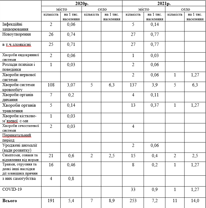 Значне зростання за рахунок померлих від COVID-19 – 33-13% від усіх померлих. Хвороби органів системи кровообігу – 137-54,2% від усіх померлих.