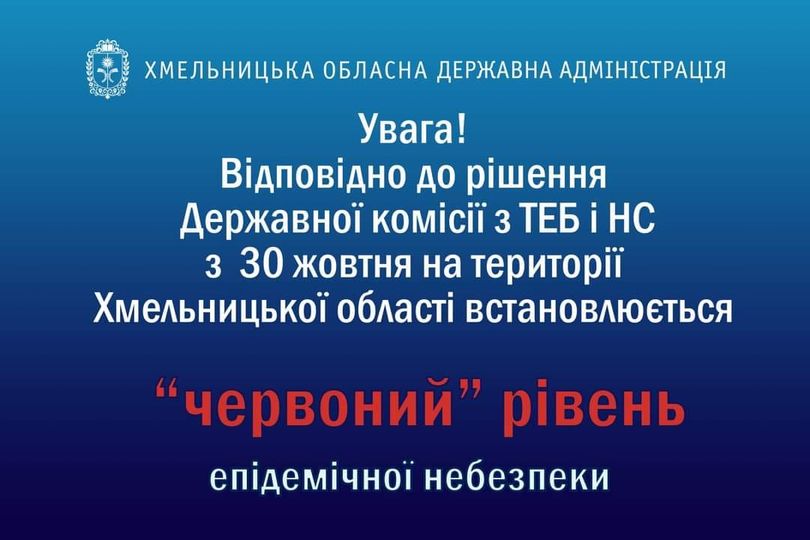 На території Хмельницької області з 00 годин 00 хвилин 30 жовтня 2021 року встановлено “червоний” рівень епідемічної небезпеки.
