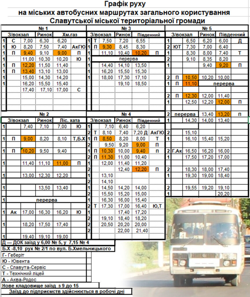 З 22 листопада 2021 р. перевезення пасажирів на міських автобусних маршрутах загального користування буде здійснюватися за новим графіком руху, затвердженим рішенням виконавчого комітету Славутської міської ради від 02.11.2021р. № 352.✍