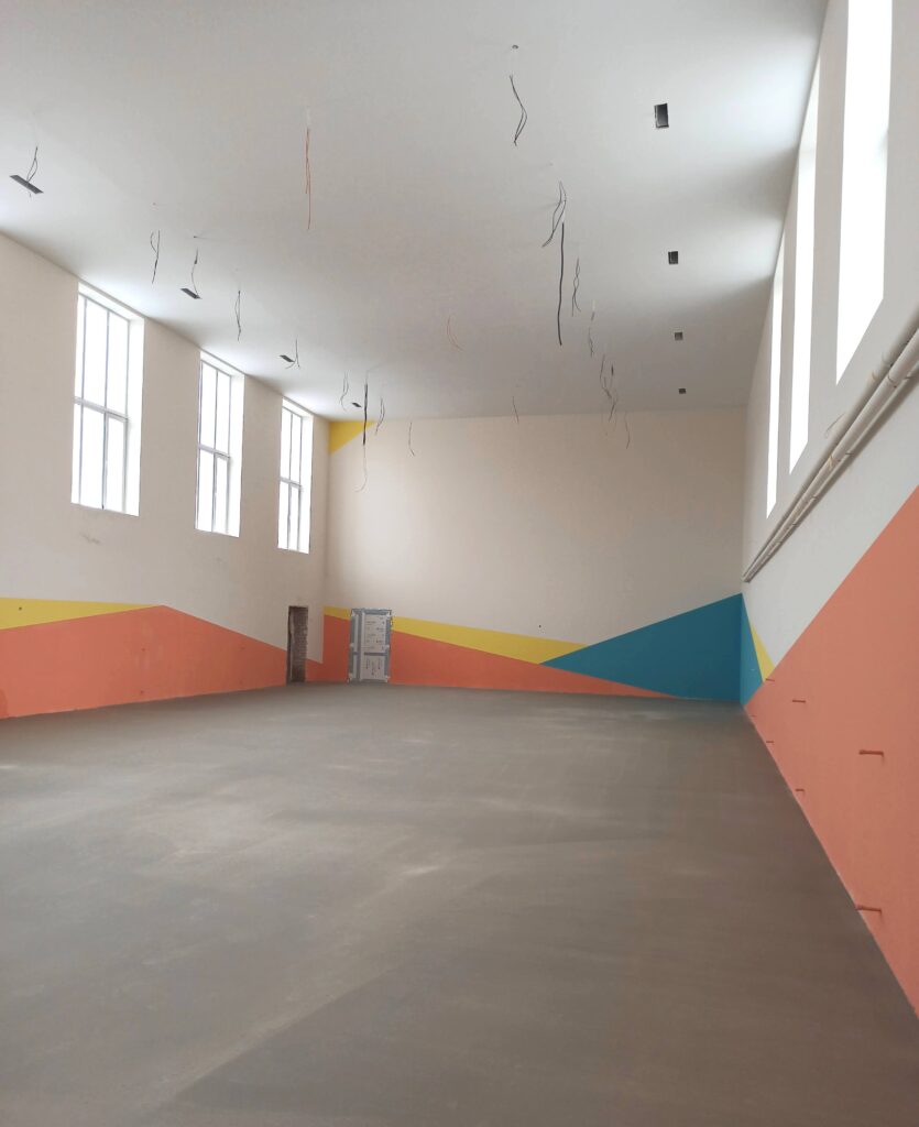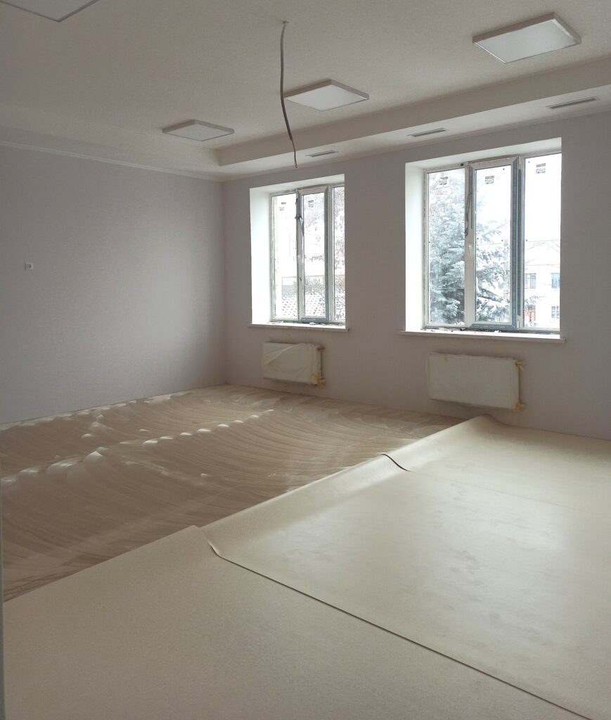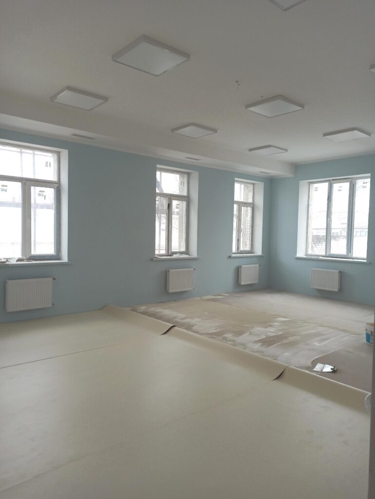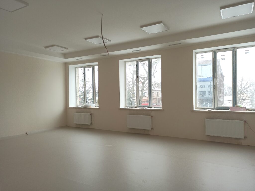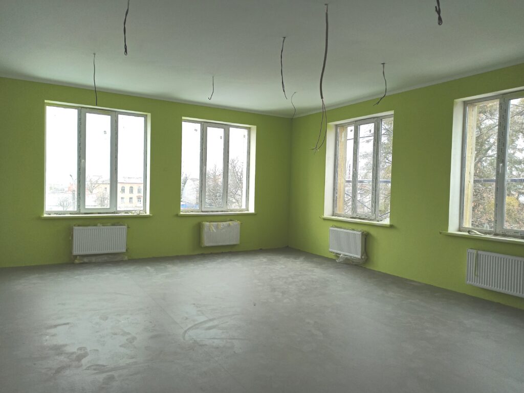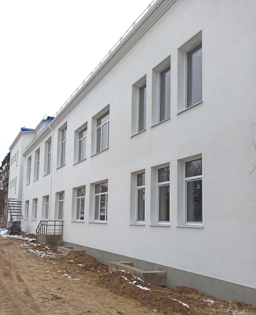 Будівельники вже завершили більшу частину робіт з утеплення та оштукатурення фасадів корпусу, а також активно проводять внутрішні оздоблювальні роботи: фарбування стін, облаштування керамічною плиткою та лінолеумом підлоги, монтаж світильників, тощо.