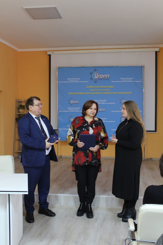 Від імені найвищого законодавчого органу держави, за дорученням народного депутата України Олексія Жмеренецького, вручила відзнаку його помічник Інна Тимощук, відзначивши, що славутська громада має достатньо талановитих активних педагогів, освітян, які заслуговують на визнання та щирі слова подяки.