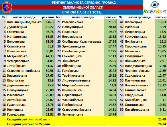 Одразу за нею із 68,83 балами – Нетішинська міська ТГ. Шепетівська міська ТГ, маючи 50,01 балів, – на сьомій сходинці рейтингу. Білогірська громада – на тринадцятій позиції. Її рейтинг – 25,9.