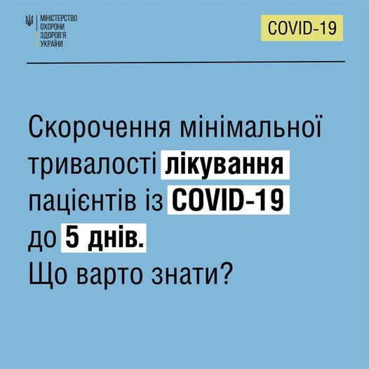 Якщо раніше хворий мав перебувати на лікуванні не менше ніж 10 днів від дати появи симптомів або ж від дати отримання позитивного тесту, то тепер цей термін скоротився до 5 днів.
