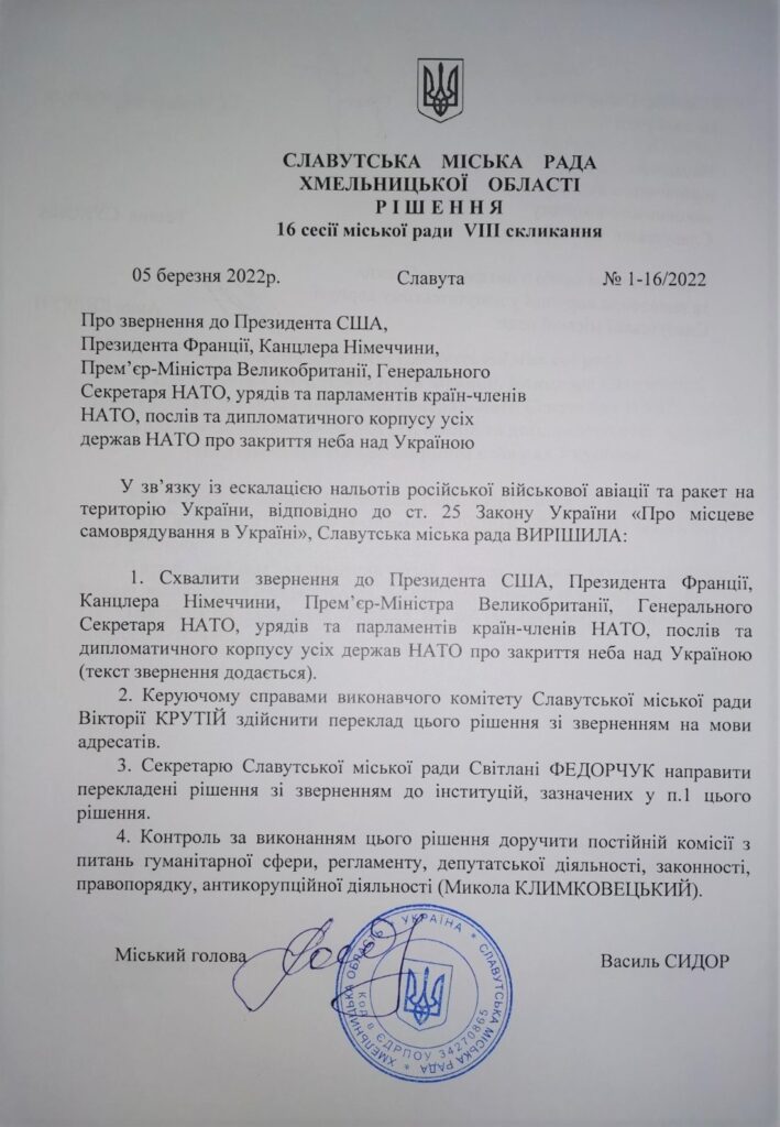 Відбулося позачергове засідання сесії Славутської міської ради, на якому розглянули єдине питання – звернення депутатів щодо негайного закриття неба над Україною.