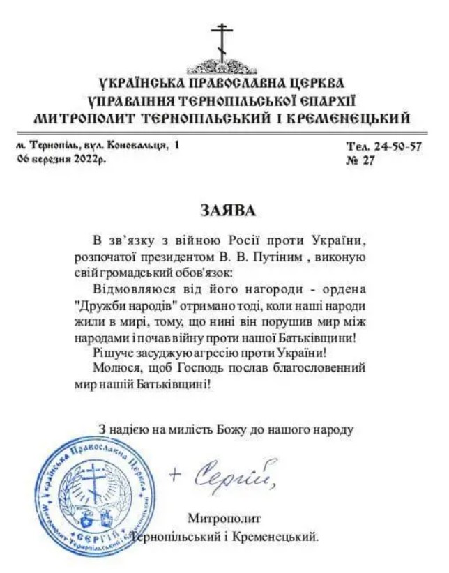 «В зв’язку з війною Росії проти України, розпочатої президентом В. В. Путіним, виконую свій громадський обов’язок: Відмовляюсь від його нагороди — ордена “Дружби народів”…», – йдеться у заяві єрарха «УПЦ МП».
