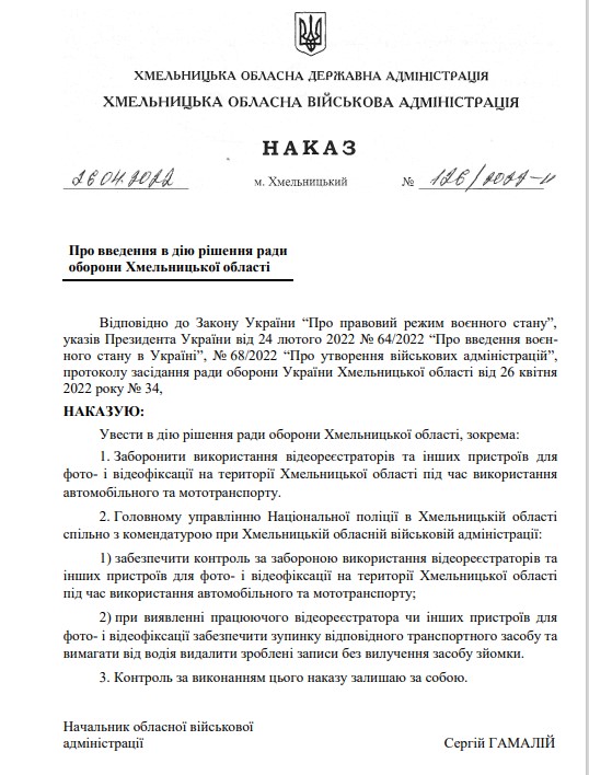 Начальник Хмельницької ОВА Сергій Гамалій наказом увів у дію рішення ради оборони Хмельниччини, яким заборонив використання в області відеореєстраторів та інших пристроїв для фото- та відеофіксації під час використання автомобільного та мототранспорту.