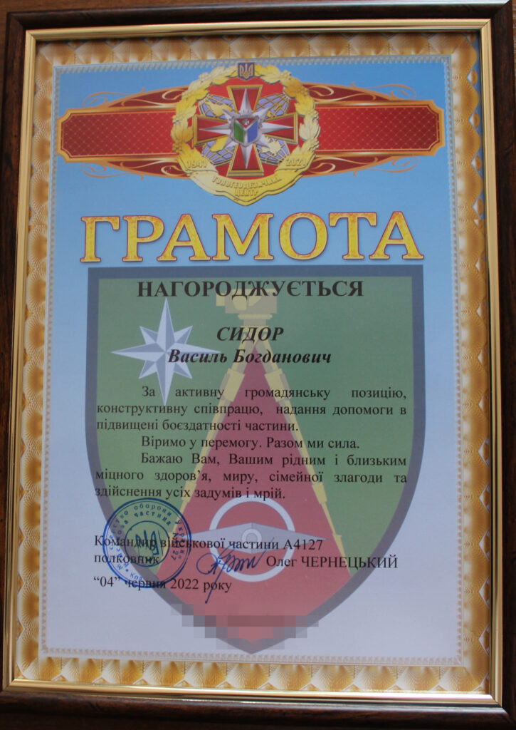 Днями Славутська громада отримала грамоту від командира військової частини А4127, полковника Олега Чернецького за допомогу, яку було надано військовій частині спільно Штабом гуманітарної допомоги Славутської міської ради та ПрАТ “Геберіт Керамік Продакшн”.