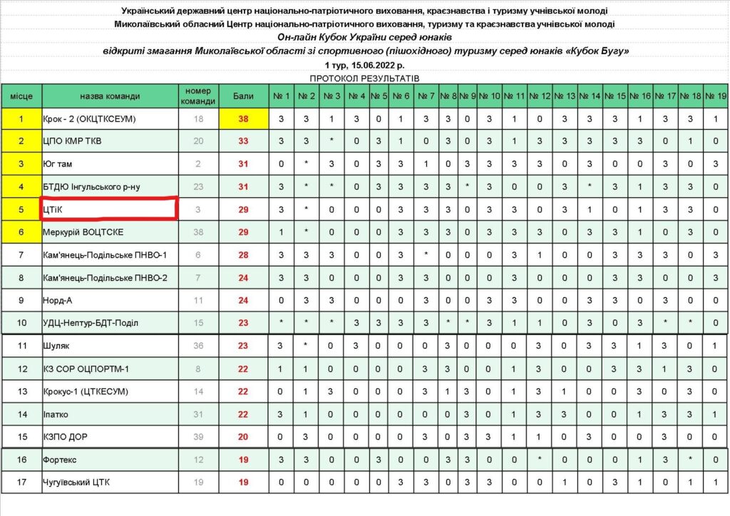 Команда туристів Дитячо-юнацького центру туризму та екологічної роботи м. Славута (капітан команди Каріна Тушевська, тренер Олександр Лук’янчук) посіла 5-те місце у першому турі та вийшла у фінал онлайн Кубку України серед юнаків «Кубок Бугу», який відбувся 15 червня.