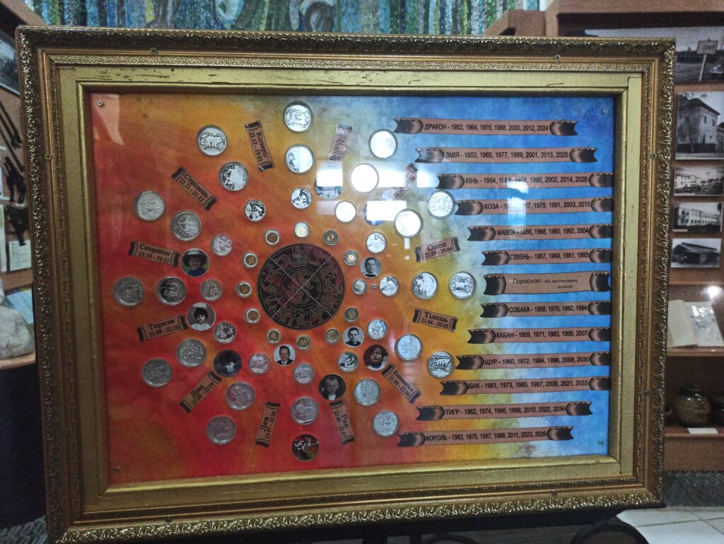 Картина місцевої художниці Людмили Поліщук «Зоряний спалах» оздоблена пам’ятними монетами Національного Банку України зі знаками зодіаку.