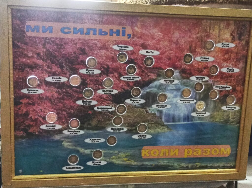 Кожен регіон інкрустований монетами НБУ із зображенням гербів населених пунктів та особливостей національного костюма кожного регіону.