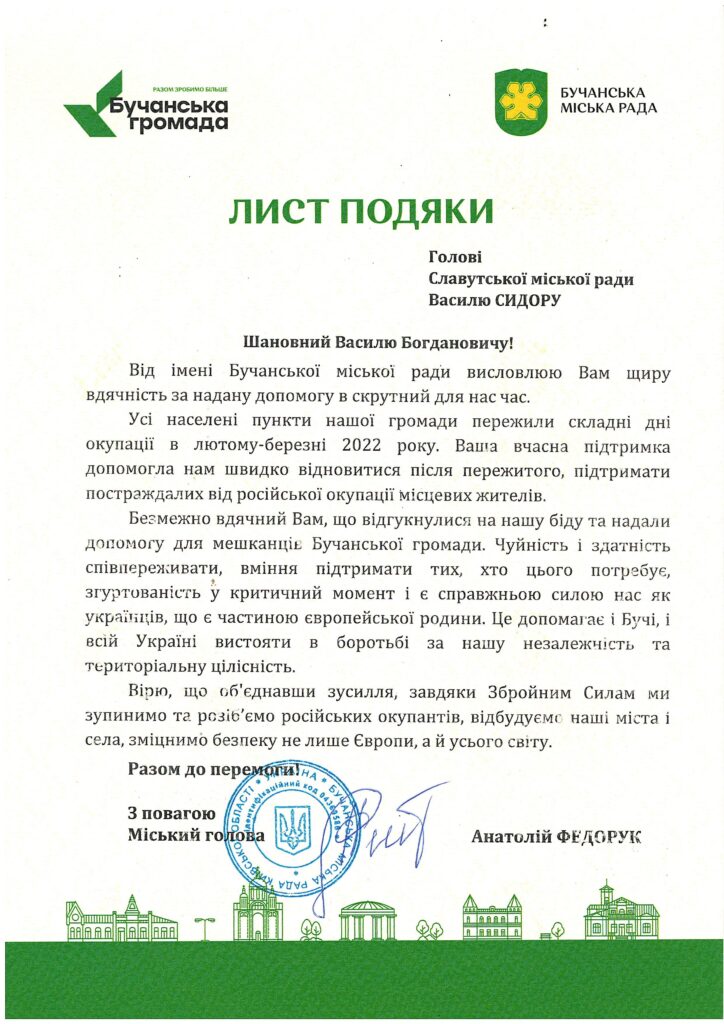 ГРОМАДА ДЛЯ ГРОМАДИ: БУЧАНСЬКА МІСЬКА РАДА ВИСЛОВЛЮЄ СЛОВА ВДЯЧНОСТІ СЛАВУТСЬКІЙ ГРОМАДІ ЗА НАДАНУ ГУМАНІТАРНУ ДОПОМОГУ Дата 26.07.202226.07.2022 Створив info-mvk