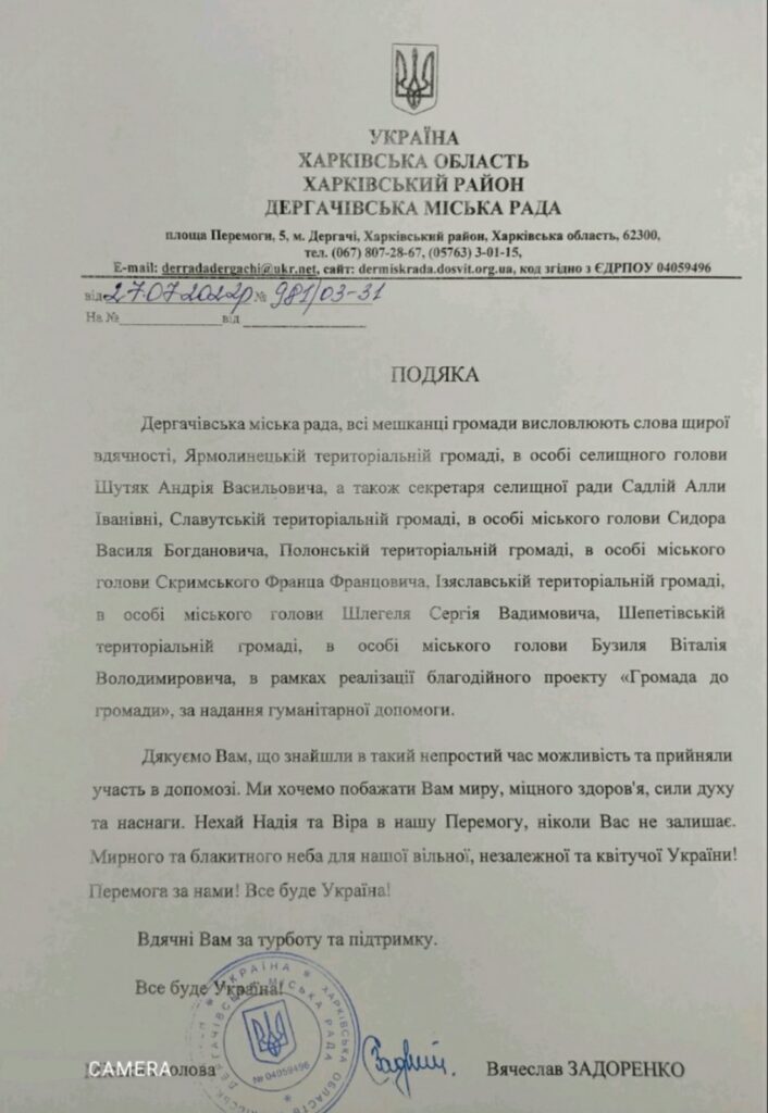 ГРОМАДА ДЛЯ ГРОМАДИ🤝: ДЕРГАЧІВСЬКА МІСЬКА РАДА ХАРКІВСЬКОЇ ОБЛАСТІ ВИСЛОВЛЮЄ СЛОВА ВДЯЧНОСТІ СЛАВУТСЬКІЙ ГРОМАДІ ЗА НАДАНУ ГУМАНІТАРНУ ДОПОМОГУ Дата 02.08.202202.08.2022 Створив info-mvk Штаб гуманітарної допомоги при Славутській міській раді.
