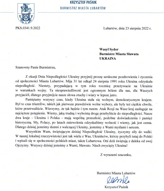 “З нагоди Дня Незалежності України прийміть сердечні привітання і побажання від громади Любартова.