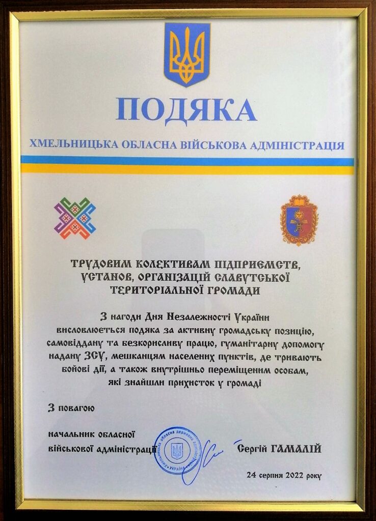 Трудовим колективам підприємств, установ, організацій Славутської територіальної громади висловлено подяку від начальника Хмельницької обласної військової адміністрації Сергія Гамалія за активну громадську позицію, самовіддану та безкорисливу працю, гуманітарну допомогу, надану Збройним Силам України, мешканцям населених пунктів, де тривають бойові дії, а також внутрішньо переміщеним особам, які знайшли прихисток в громаді.