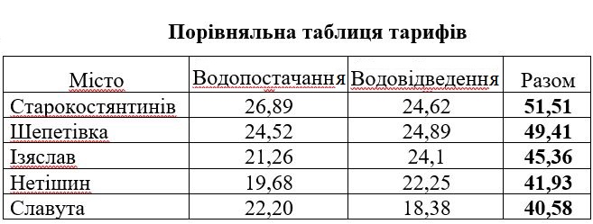 Славутське управління водопровідно-каналізаційного господарства надає порівняльний аналіз тарифів на послуги з централізованого водопостачання та водовідведення Славути та сусідніх міст станом на вересень 2022 року: