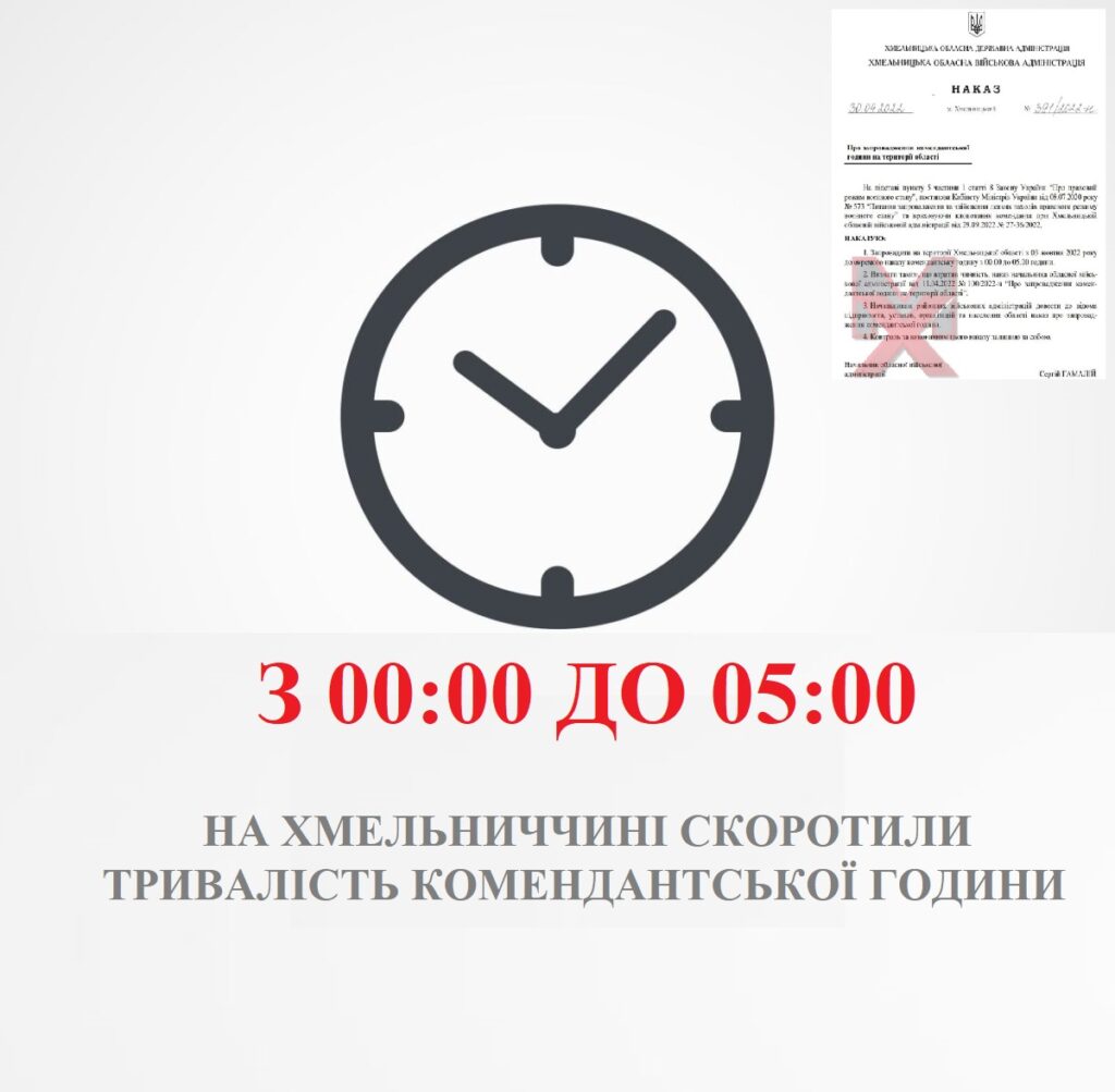 “Запровадити на території Хмельницької області з 3 жовтня 2022 року до окремого наказу комендантську годину з 00.00 до 05.00 години”.